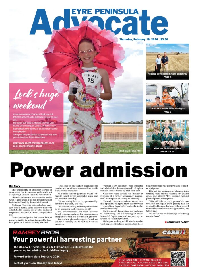 Eyre Peninsula Advocate Cleve – 19th February 2026 Subscribe or Login to see the rest of the content. Username Password * Remember Me Forgot Password News Regional Event Fund opens 06/03/2026 Event organisers throughout Eyre Peninsula have the chance to secure financial backing, with the South Australian Tourism Commission (SATC) inviting applications for its 2026-27... Great team of women leading Robin Hood 06/03/2026 Robin Hood Real Estate may have a man’s name but it was founded by a woman - a strong, determined, not scared to get... Big nannygai at Sceale Bay 06/03/2026 Most of the wild weather looks to be behind us and more stable conditions appear to be coming in. The winds are dropping off and...