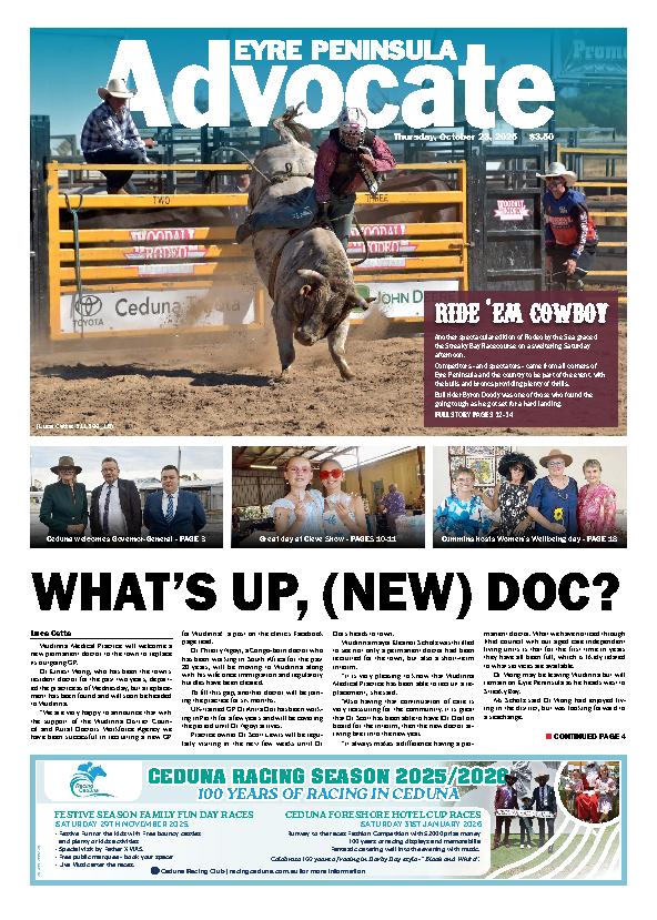 Eyre Peninsula Advocate Cleve – 23rd October 2025 Subscribe or Login to see the rest of the content. Username Password * Remember Me Forgot Password News Close bowls played in stormy weather 28/10/2025 All pennant games were decided by eight shots or less in a fascinating round of Eastern Eyre bowls, played in stormy weather on Saturday... Tight games feature in opening round 28/10/2025 Exceptionally close games were the highlight of the opening round of Cleve Basketball Association on Thursday 20 October. Women’s teams Eclairs and Splashbacks drew 28-28... Drink-driver loses licence 28/10/2025 A man lost his licence and car for drink-driving in Ceduna. Police stopped a vehicle on Thevenard Road just before 6am on Friday 24 October...