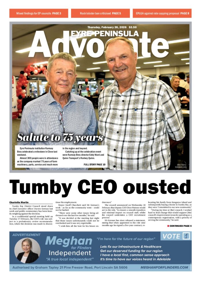 Eyre Peninsula Advocate Cleve – 26th February 2026 Subscribe or Login to see the rest of the content. Username Password * Remember Me Forgot Password News Regional Event Fund opens 06/03/2026 Event organisers throughout Eyre Peninsula have the chance to secure financial backing, with the South Australian Tourism Commission (SATC) inviting applications for its 2026-27... Great team of women leading Robin Hood 06/03/2026 Robin Hood Real Estate may have a man’s name but it was founded by a woman - a strong, determined, not scared to get... Big nannygai at Sceale Bay 06/03/2026 Most of the wild weather looks to be behind us and more stable conditions appear to be coming in. The winds are dropping off and...