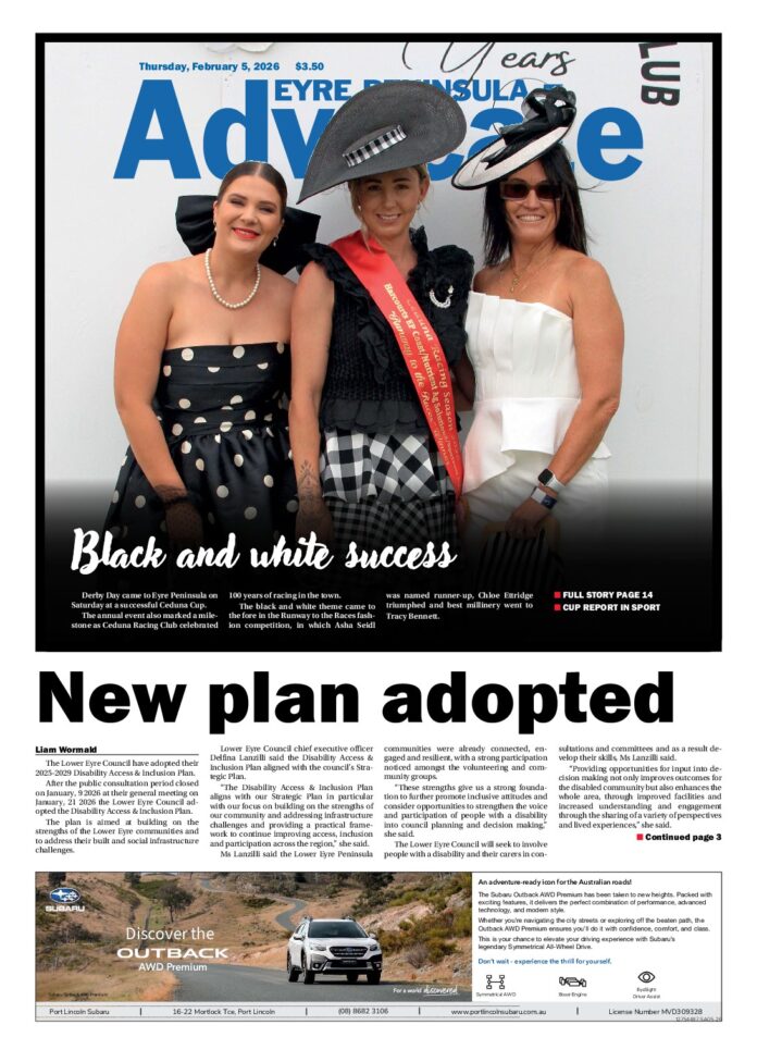 Eyre Peninsula Advocate Cleve – 5th February 2026 Subscribe or Login to see the rest of the content. Username Password * Remember Me Forgot Password News Regional Event Fund opens 06/03/2026 Event organisers throughout Eyre Peninsula have the chance to secure financial backing, with the South Australian Tourism Commission (SATC) inviting applications for its 2026-27... Great team of women leading Robin Hood 06/03/2026 Robin Hood Real Estate may have a man’s name but it was founded by a woman - a strong, determined, not scared to get... Big nannygai at Sceale Bay 06/03/2026 Most of the wild weather looks to be behind us and more stable conditions appear to be coming in. The winds are dropping off and...