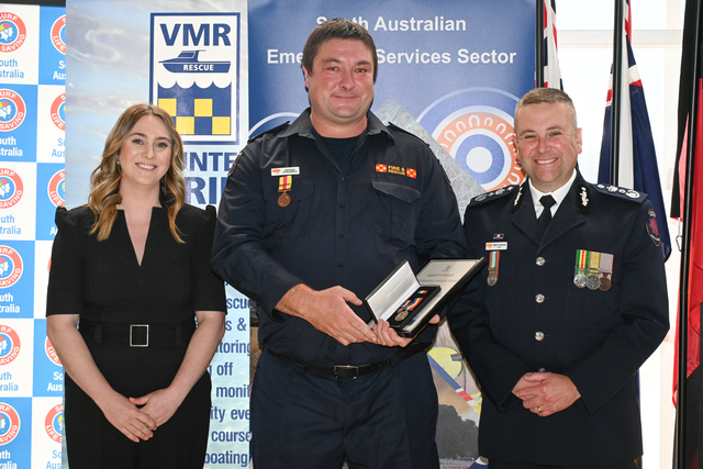 Country Fire Service Western Eyre group officer Anthony Rosenzweig, centre, receiving his award from Emergency Services Minister Rhiannon Pearce and CFS chief officer Brett Loughlin. (Supplied)