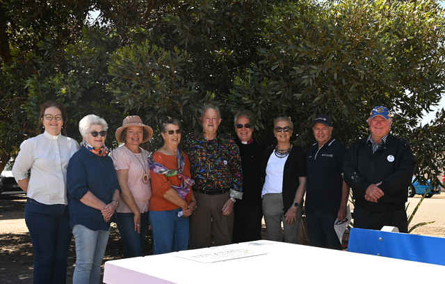 Dignitaries and community members at the unveiling were Archdeacon of Eyre Susan Johnson, Helen Ware, Glenys Sauturaga, Francie Boylan, Father Brian Bascombe, Bishop of Wilochra Jeremy James, Caryll Cabot and Lions David Pearson and Wayne Branson. (Charlotte Martin: 520209_01)