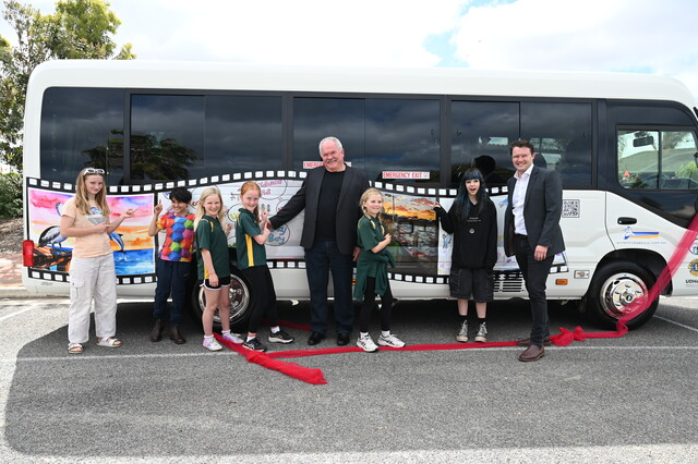 Several young artists from the Tumby Bay district have their work featured on the new Community Bus. Pictured are: Rahni, Jay, Lola, Indie, mayor Geoff Churchett, Georgie, Narrah, and Tom Venning. (Charlotte Martin: 518425_01)