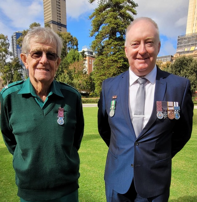 Lawrence Tomney with SA Ambulance Service chief executive officer Rob Elliott. Lawrence retired after more than five decades as a volunteer. (Supplied)