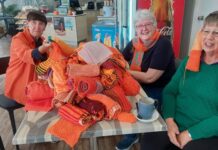 Group members stitched together knitting and wrapped bright orange markers...