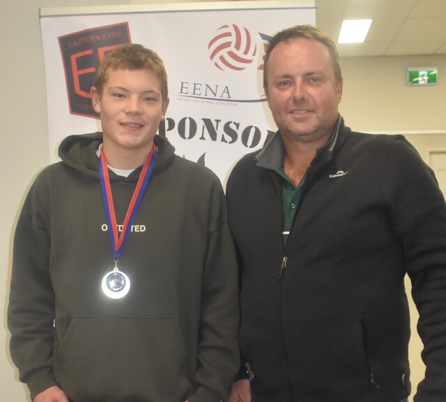 Eastern Eyre Football League senior colts best and fairest Lincoln Fisher was presented with the Fiegert Family Medal by Buzz Fiegert on Saturday evening. (Bev Story: 499949_04)