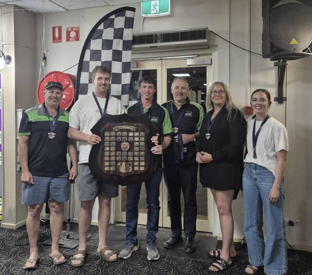 Ceduna Dirt Circuit Club members David Moyse, Toby Lee, Jason Irvine, Colin Thiele, Kimberly Marden and Ricca Moyse celebrate winning the Duns Brothers Trophy. (Supplied)