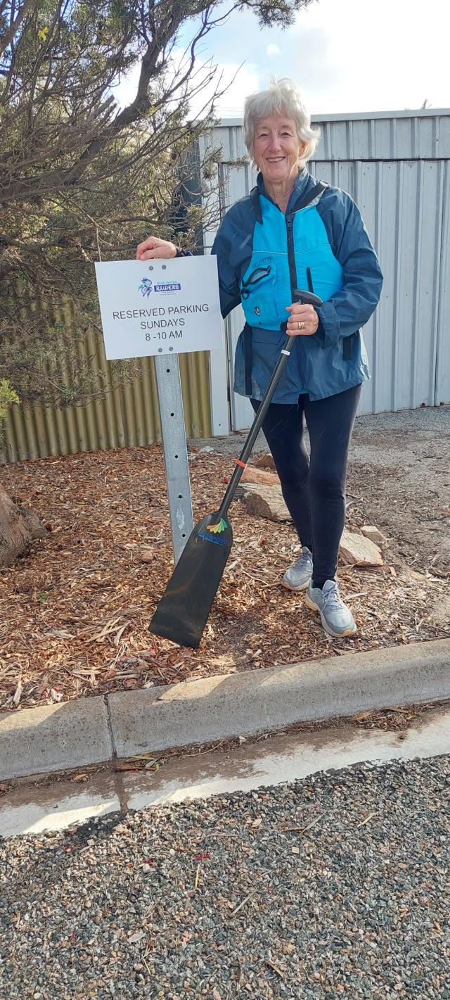 Paddler Judy Stirling at the reserved parking sign. (Supplied)