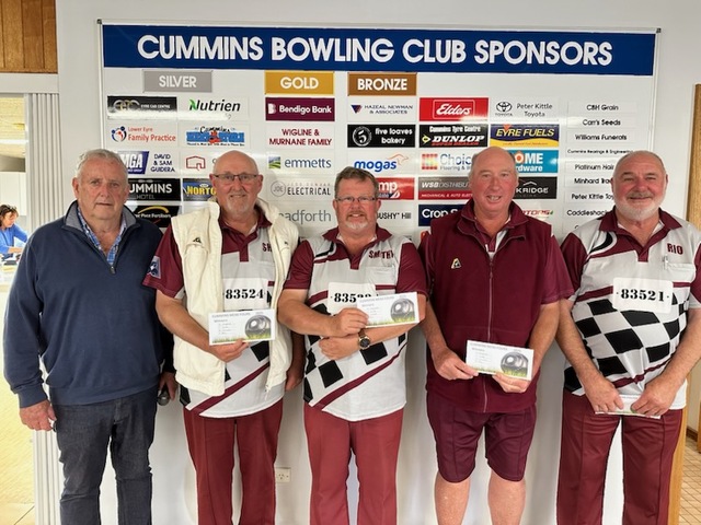 Mark Sheehan from the Cummins Match and Tournament committee with men's fours winning team of Kym Shepherd, Trevor Smith, Mark Cameron and Peter Allen from Tumby Bay. (Supplied)
