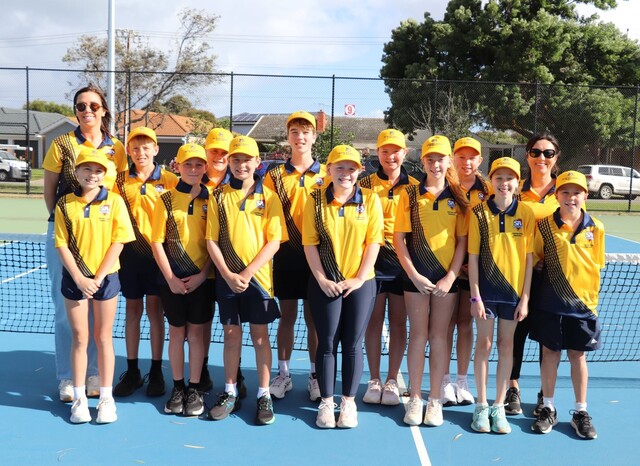 Central Eyre Peninsula’s SAPSASA tennis team. Back: Team manager Imogen Sampson, Noah Sampson, Arly Wake, Zane Frischke, Aicha Vandeleur, Ayla Seaman, coach Ash Inglis; front: Mia Arcus, Tayt Bates, Harvey Scott, Maddie Venning, Milla Barns, Isla Elson and Noah Inglis. (Supplied)