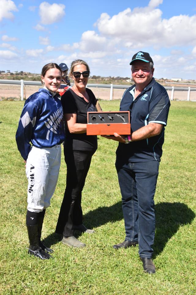 Jockey Alyssa Webb, trainer Megan Gillespie and Ceduna Racing Club president Bruce Zippel after the race five triumph. (Andrew Brooks: 521554_09)