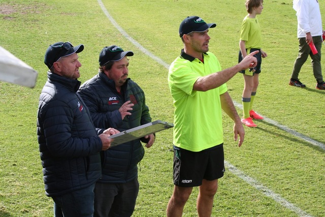 Eastern Eyre Football League Mortlock Shield reappointed coaches Henry Zwar and Brad Woolford with runner Wayne Piggott at the 2025 carnival. (Supplied)